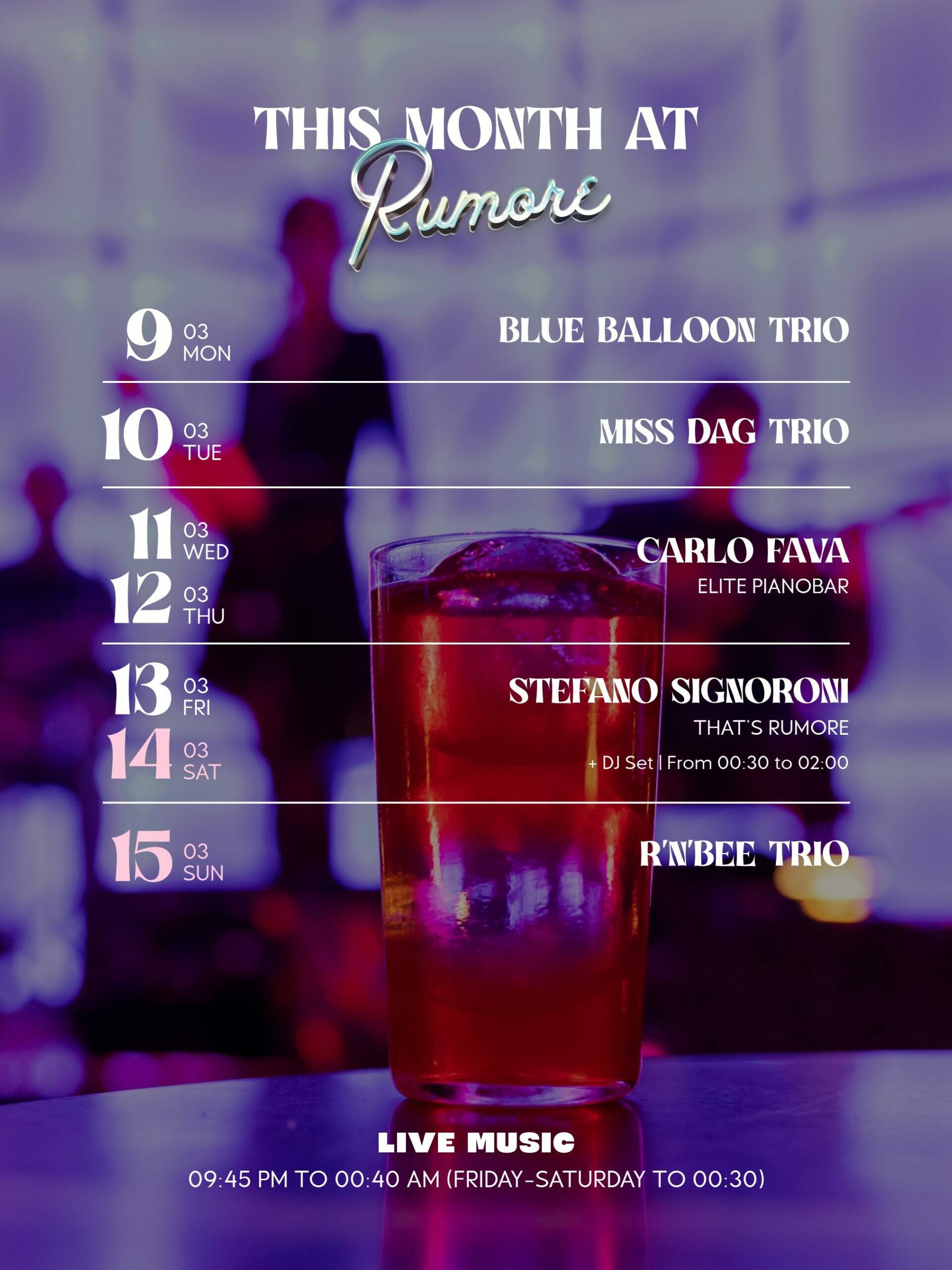 Rumore offre una selezione unica dei migliori liquori al mondo, una scelta esclusiva di champagne ed una selezione ben definita di cocktail indimenticabili.